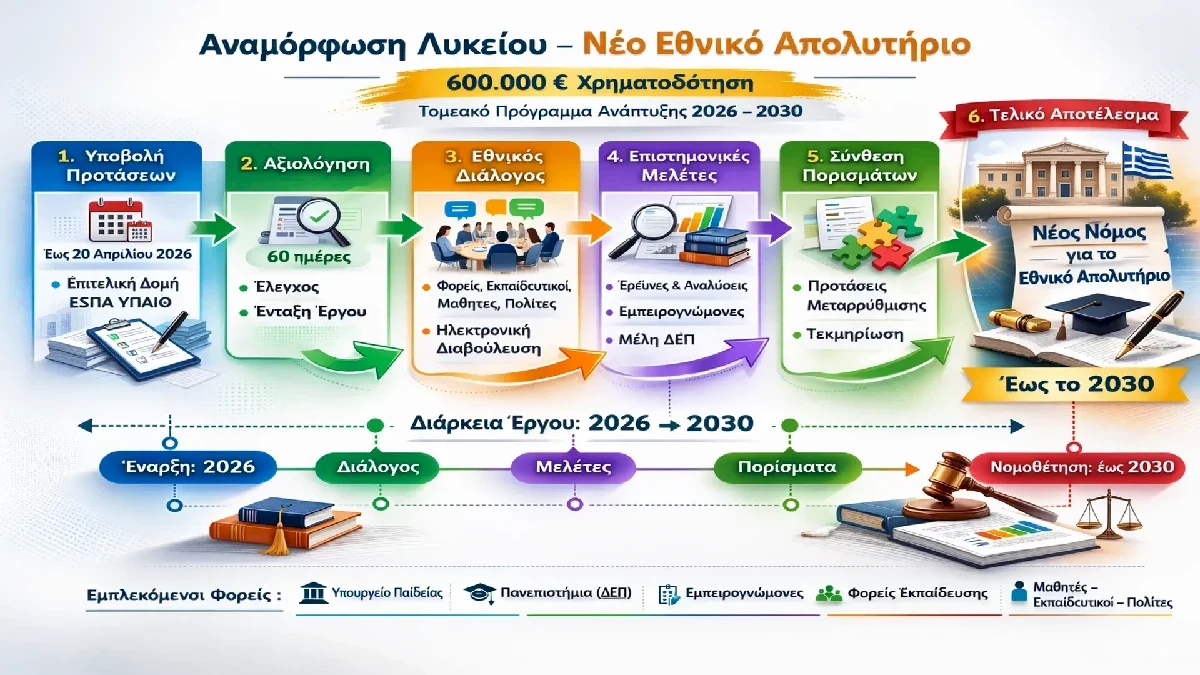 Σε διαδικασία προετοιμασίας μιας από τις σημαντικότερες αλλαγές στη δευτεροβάθμια εκπαίδευση εισέρχεται το Υπουργείο Παιδείας, ενεργοποιώντας χρηματοδοτούμενο έργο στο πλαίσιο του Τομεακού Προγράμματος Ανάπτυξης 2026-2030. Η δράση, προϋπολογισμού 600.000 ευρώ, δεν αποτελεί άμεση νομοθετική πρωτοβουλία αλλά το στάδιο που προηγείται της νομοθέτησης: την παραγωγή τεκμηρίωσης και συναίνεσης για τη θέσπιση του Εθνικού Απολυτηρίου.