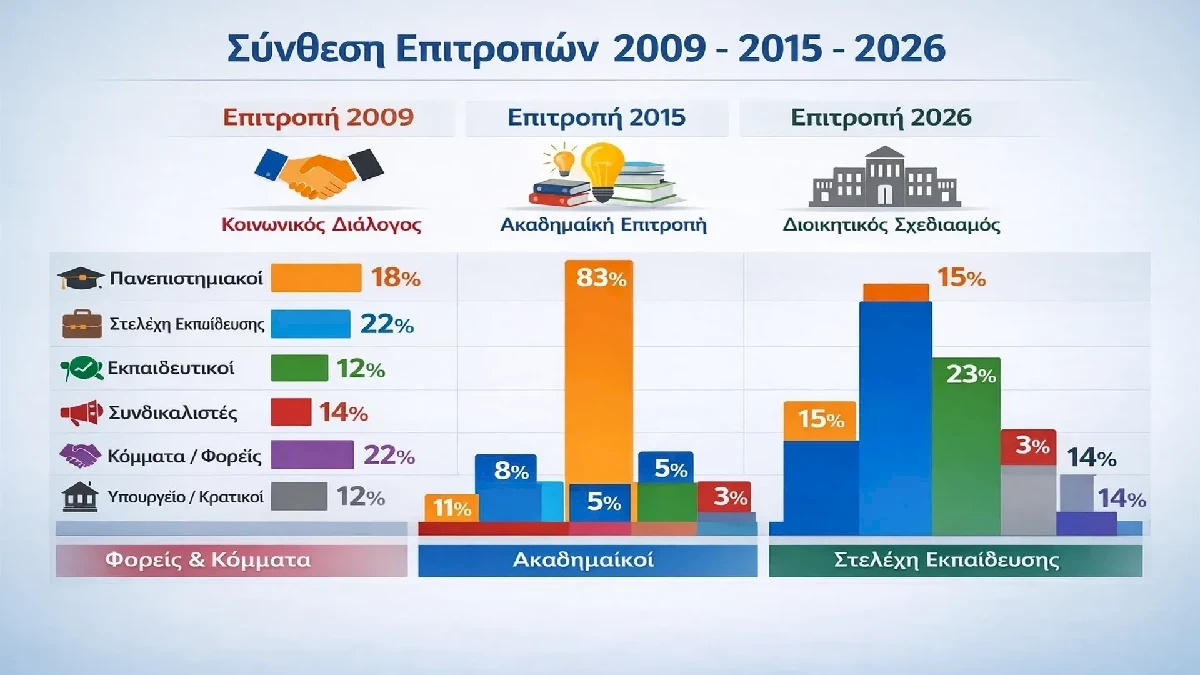 Η νέα σύνθεση περιλαμβάνει ακαδημαϊκούς, σχολικούς συμβούλους, εκπαιδευτικούς της τάξης και ειδικούς επιστήμονες, καλύπτοντας ένα ευρύτατο φάσμα γνωστικών αντικειμένων, από τις Θετικές Επιστήμες και την Πληροφορική έως τις Ανθρωπιστικές Σπουδές και τις Τέχνες.