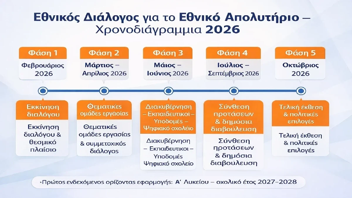Ο Εθνικός Διάλογος θα διαρκέσει εννέα μήνες, από τον Φεβρουάριο έως τον Οκτώβριο του 2026, και περιλαμβάνει φάσεις εκκίνησης, θεματικών ομάδων εργασίας, δημόσιας διαβούλευσης και τελικής έκθεσης πολιτικών επιλογών.