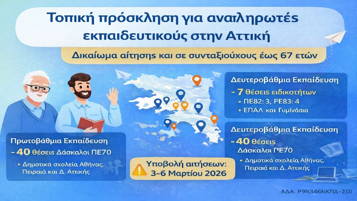 Συνολικά προκηρύσσονται περισσότερες από 40 θέσεις σε δημοτικά σχολεία της Αττικής, μεταξύ των οποίων: