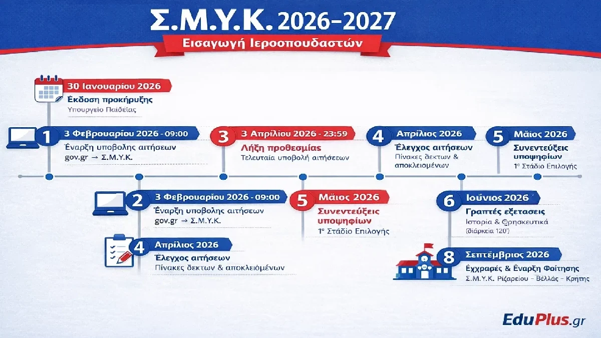 Το Υπουργείο Παιδείας, Θρησκευμάτων και Αθλητισμού προχώρησε στην έκδοση της προκήρυξης για την εισαγωγή ιεροσπουδαστών στις Σχολές Μαθητείας Υποψηφίων Κληρικών (Σ.Μ.Υ.Κ.) για το εκπαιδευτικό έτος 2026–2027.