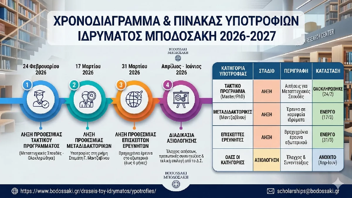 Το Ίδρυμα Μποδοσάκη, πιστό στο όραμα του ιδρυτή του για την προαγωγή της παιδείας και της επιστήμης στην Ελλάδα, ανακοίνωσε τα προγράμματα υποτροφιών του για το ακαδημαϊκό έτος 2026-2027. Με μια παράδοση που μετρά πάνω από 50 χρόνια και περισσότερες από 2.700 υποτροφίες, το Ίδρυμα συνεχίζει να αποτελεί πυλώνα στήριξης για την ελληνική επιστημονική κοινότητα.